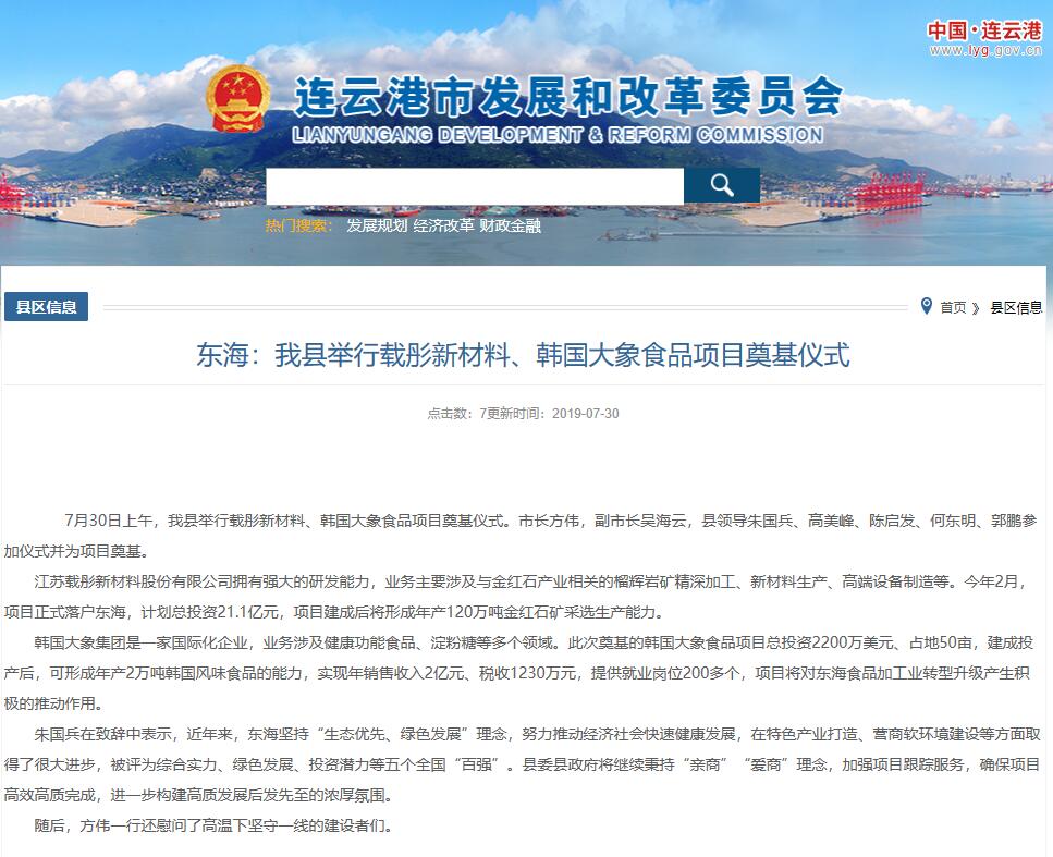 7月30日上午,日照石榴石礦業(yè)東海項(xiàng)目—江蘇載彤新材料金紅石深加工項(xiàng)目在東??h舉行開工奠基儀式,連云港市長方偉,副市長吳海云,東??h領(lǐng)導(dǎo)朱國兵、高美峰、陳啟發(fā)、何東明、郭鵬參加儀式并共同為項(xiàng)目培土奠基。載彤新材料金紅石深加工項(xiàng)目作為縣、市重點(diǎn)推進(jìn)項(xiàng)目受到各方領(lǐng)導(dǎo)和媒體的關(guān)注,連云港市發(fā)展和改革委員會并對奠基儀式進(jìn)行了跟蹤報道。